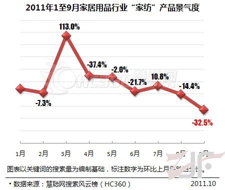 从图中分析看,9个月份中3月份是家纺产品的销售旺季,三月份正是一年开始忙碌的季节,消费者也忙着采购,市场景气度非常的活跃,采购的人们也比较多,所以三月份迎来了市场采购的高峰期,而4、5、6月份市场逐渐的平稳下来了。在7月份环比较上两个月稍有上涨的时候,8、9月份又迎来了下降的趋势。