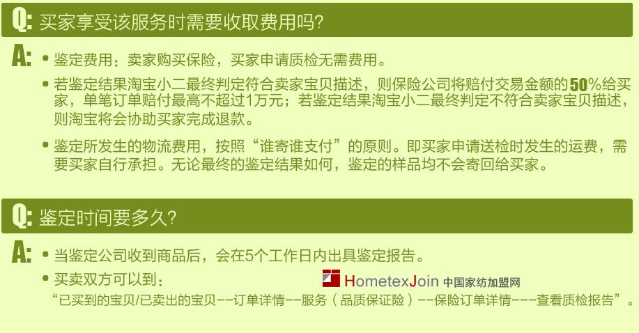 今年3月,淘宝官方就公布,消费者在购买家居用品时,如对商品质量问题存疑,可在发起退货过程中申请第三方鉴定,如果质检结果是非人为质量问题,卖家将给予全额退款;如果结果是人为问题或不存在质量问题,将由保险公司赔付消费者交易金额的50%。而鉴定费用将由购买保险的卖家承担,买家申请质检无需费用。