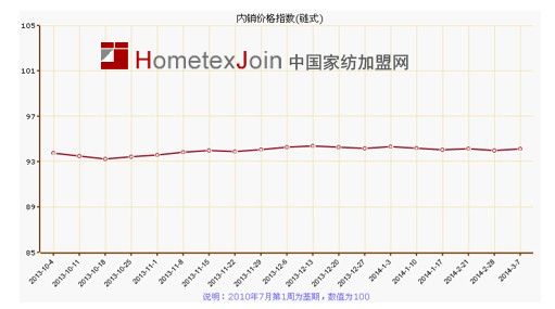 据叠石桥家纺指数监测数据显示:2014年3月第一周家纺制成品内销价格指数上涨,同比2月第四周上涨0.15%,当前3月第一周叠石桥内销价格指数收盘于94.12点。