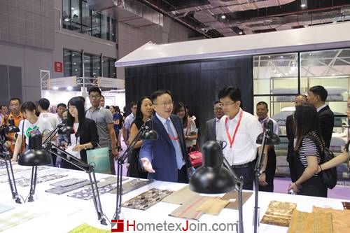 在中国家纺协会会长杨兆华、江苏海门工业园区管委会主任江永军等人的陪同下,中国纺织工业联合会会长王天凯一行参观了流行趋势展区,听取了趋势研发小组成员对趋势主题的解读和对参与企业选送面料的介绍。