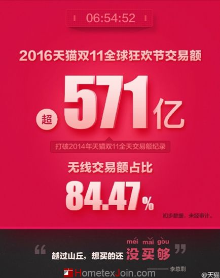 11月11日消息,来自天猫数据显示,截至11日早间6点54分,天猫双11成交额达571亿元,打破2014年天猫双11全天交易额纪录。